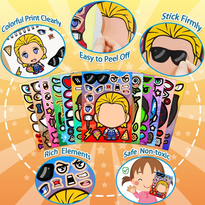 - Funny DIY Superhero Face Stickers Pack: You will get 48 sheets of 12 different superhero characters, 4 sheets of each character. Each sheet size is about 8.3 x 5.9 inch, friendly size for child's small hands