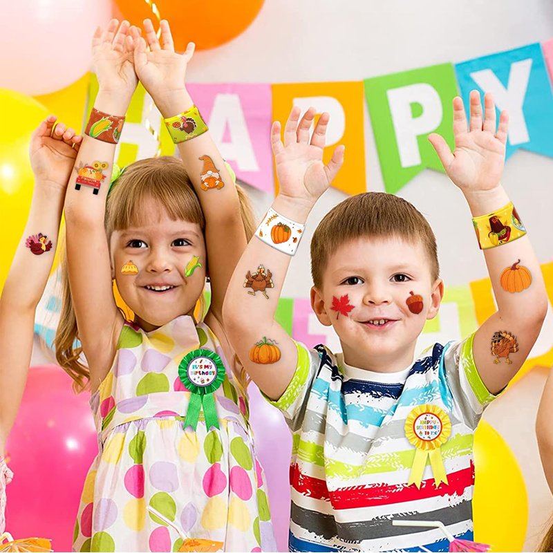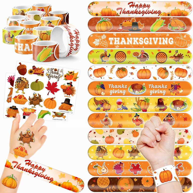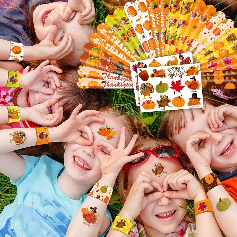 - šćPERFECT GIFT FOR THANKSGIVING ENTHUSIASTSć: Our Thanksgiving Temporary Tattoos and Slap Bracelets are the perfect gift for people of all ages, from kids to adults. Suitable for any occasion, they offer an affordable and delightful option. Whether for school events, birthdays, or stocking stuffers, this Thanksgiving themed collection adds a fashionable and nostalgic element to anyone's accessory collection, invoking happiness and cherished memories.