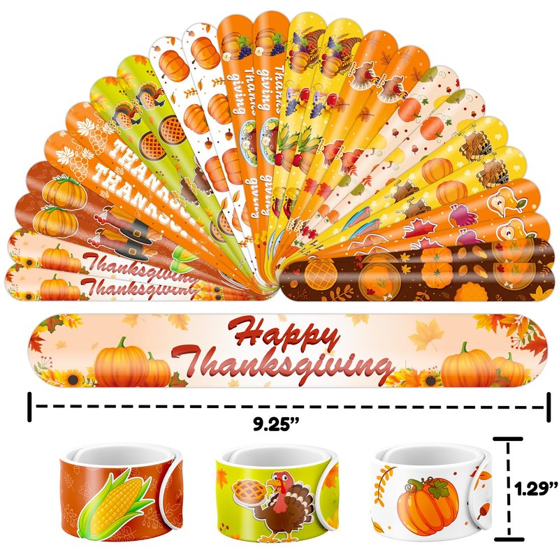 š„³ćDELIGHTFUL THANKSGIVING PARTY FAVORS BUNDLEć: Get ready for laughter with our set of 24 temporary tattoo stickers and 24 slap bracelets. Each piece showcases vibrant and adorable designs inspired by the Thanksgiving theme. Perfect for both kids and adults, this bundle ensures endless fun. The bracelets measure 23.5cm x 3.3cm, providing a satisfying "slapping" experience as they effortlessly wrap around your wrist. šæćDURABLE AND COMFORTABLEć: Constructed from high-quality materials, our slap bracelets are built to withstand wear and tear. The sturdy metal core is encased in soft PVC, ensuring safety, comfort, and longevity. With a smooth surface and no sharp edges, these bracelets offer a gentle and enjoyable feeling on your skin. Designed for daily use, they maintain their vivid colors and shape, adding a charming and nostalgic touch to your accessory collection. šćEFFORTLESSLY STYLISHć: Embrace the simplicity and trendiness of wearing our slap bracelets. With just a gentle "slap," they wrap around your wrist effortlessly, creating a comfortable and stylish look. Lightweight and comfortable for extended wear, they're perfect for parties, special occasions, or everyday fashion. These accessories bring a playful charm to any gathering, capturing the joyful spirit of the Thanksgiving theme. Let the festivities begin! šæćVERSATILE AND PORTABLEć: Take the fun with you wherever you go with our versatile slap bracelets. Their compact and lightweight design allows for easy carrying in your pocket, purse, or backpack. Whether at school, work, or social gatherings, wearing them instantly adds a lively and fashionable touch to your outfit. With their playful and nostalgic appeal, these bracelets are sure to attract attention and bring smiles wherever you venture. Get ready! šćPERFECT GIFT FOR THANKSGIVING ENTHUSIASTSć: Our Thanksgiving Temporary Tattoos and Slap Bracelets are the perfect gift for people of all ages, from kids to adults. Suitable for any occasion, they offer an affordable and delightful option. Whether for school events, birthdays, or stocking stuffers, this Thanksgiving themed collection adds a fashionable and nostalgic element to anyone's accessory collection, invoking happiness and cherished memories.