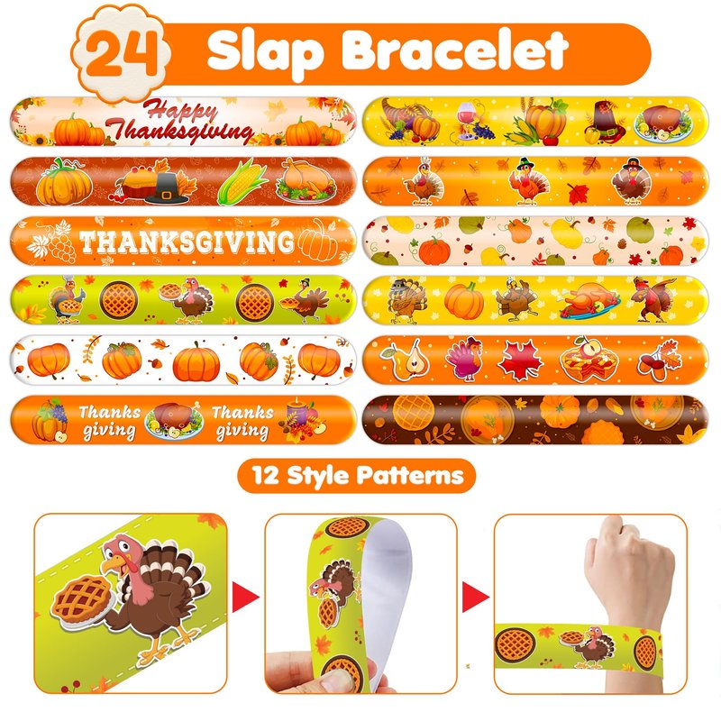 - šćEFFORTLESSLY STYLISHć: Embrace the simplicity and trendiness of wearing our slap bracelets. With just a gentle "slap," they wrap around your wrist effortlessly, creating a comfortable and stylish look. Lightweight and comfortable for extended wear, they're perfect for parties, special occasions, or everyday fashion. These accessories bring a playful charm to any gathering, capturing the joyful spirit of the Thanksgiving theme. Let the festivities begin!