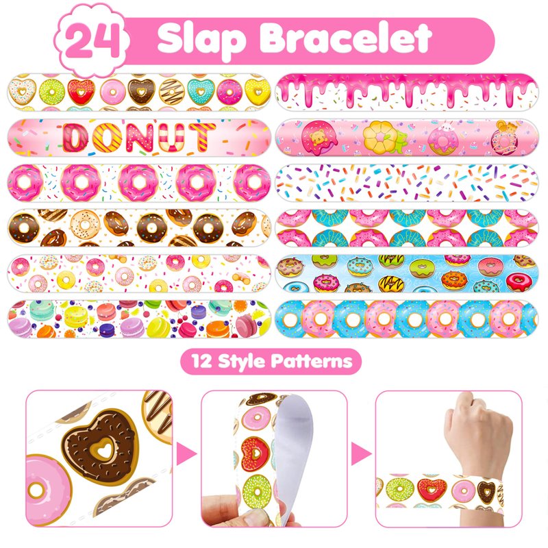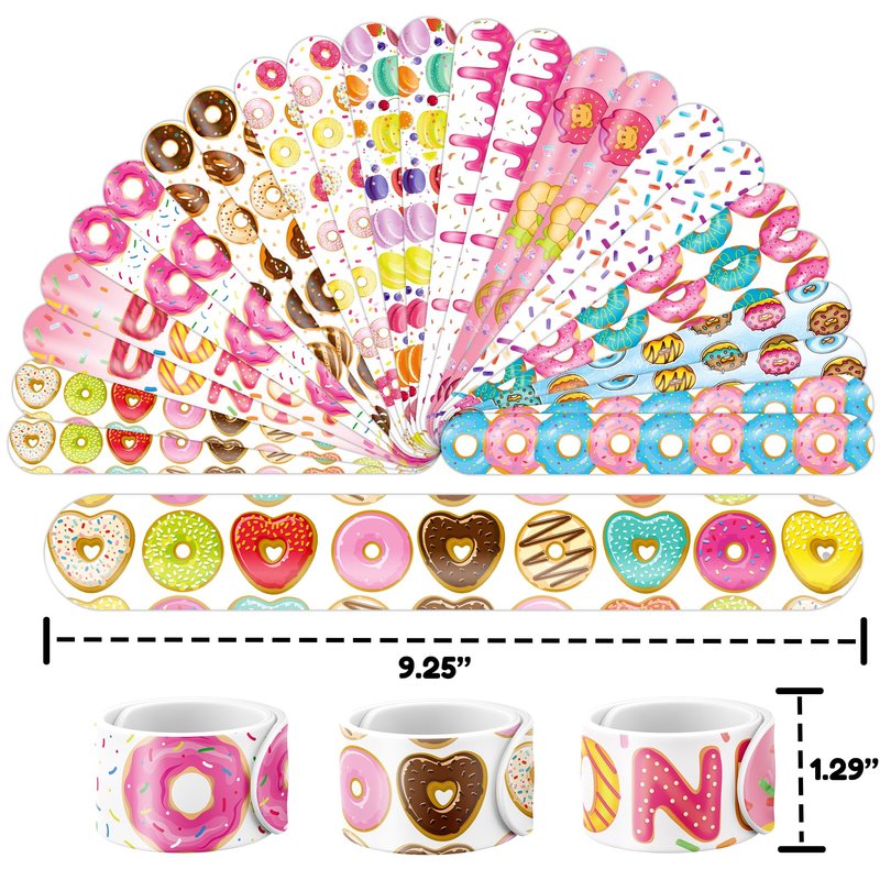 - š©ćDONUT PARTY FAVORS DELIGHTFUL BUNDLEć: Prepare for giggles with our set of 24 slap bracelets and 24 temporary tattoo stickers. Each piece features a lively and adorable design inspired by the DONUT theme. Perfect for kids and adults alike, this bundle promises boundless enjoyment. The bracelets measure 23.5cm x 3.3cm, providing a gratifying "slapping" experience as they effortlessly encircle your wrist.