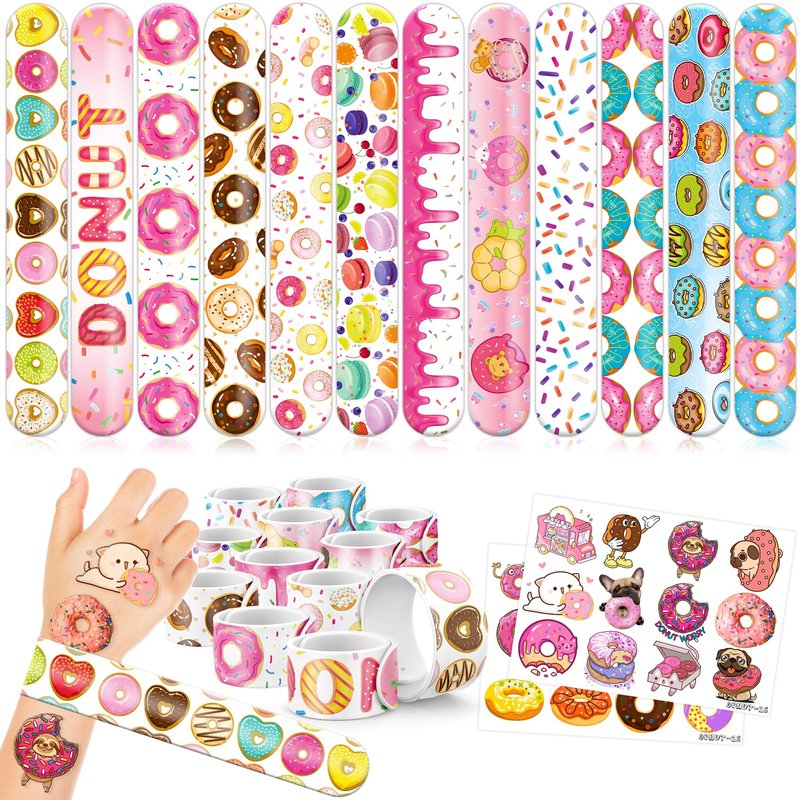 48PCS Donut Party Favors 24PCS Tattoos 24PCS Slap Bracelets Wristbands Themed Birthdays Party Supplies Decorations Decor Pattern Girls Boys Gifts School Classroom Prize Carnival Christmas Reward