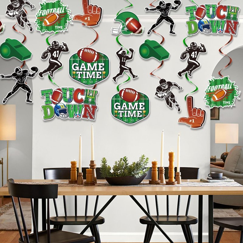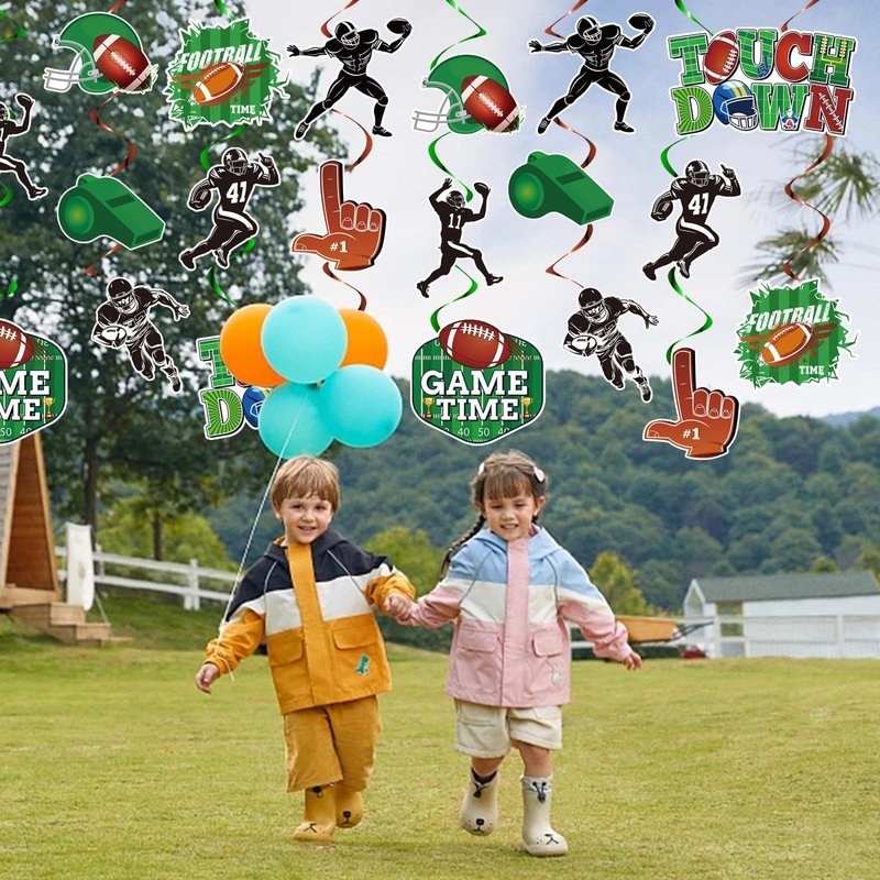 - 【Features】Our football party decorations are vibrant and visually striking, combining vibrant greens with warm browns. This colorful touchdown banner and football birthday party swirl set is sure to make any party festive. Football themed streamers are a great addition to any party space, and go great with football plates, tableware sets, tablecloths, and more, adding a touch of fun and excitement to any party.
