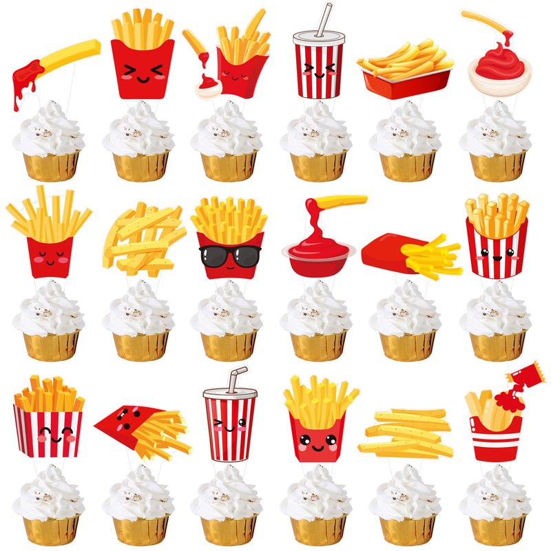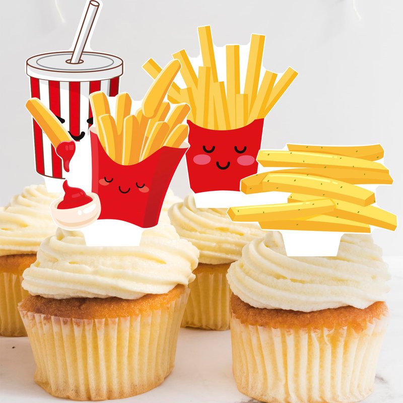 - 【Simple use fast food birthday party decorations】The no-assembly french fries cupcake toppers allow you to quickly set up your party and use the product as soon as you receive it to decorate your birthday cake, cupcake, pudding, pancake, waffles, ice cream and more to instantly enhance your dessert.