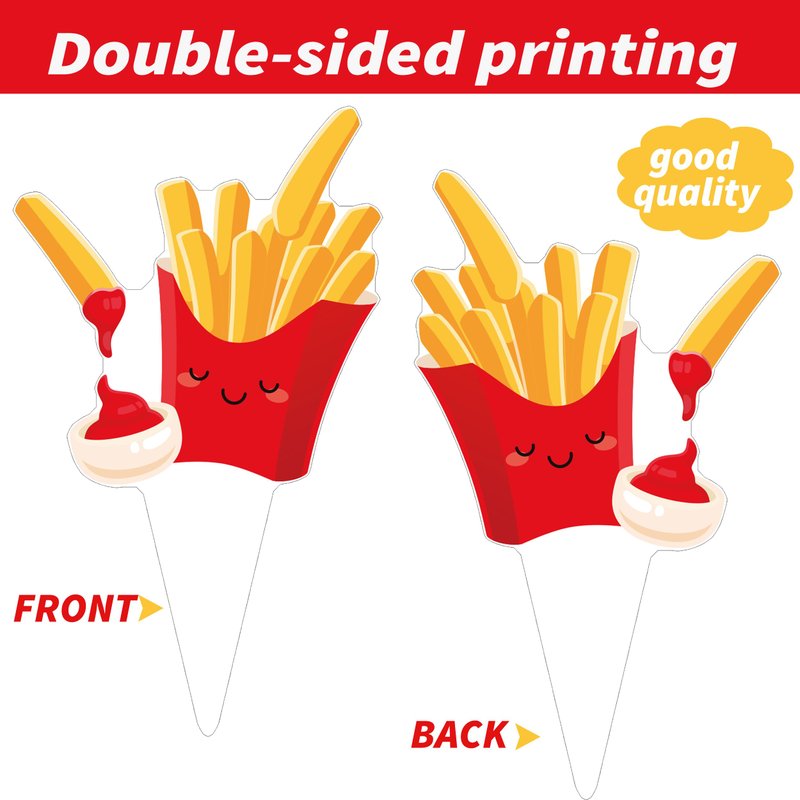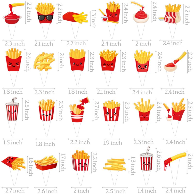 - 【24 different designs french fries party decoration】48Pcs french fries cupcake toppers include 24 different shpes of french fries. The unique french fries shapes that decorate your cupcakes look more delicious.
