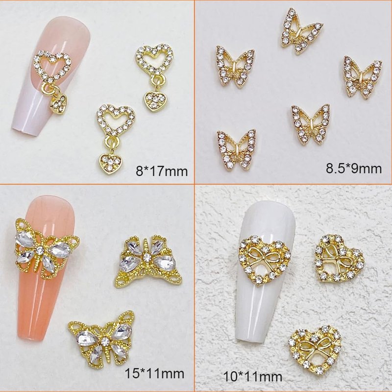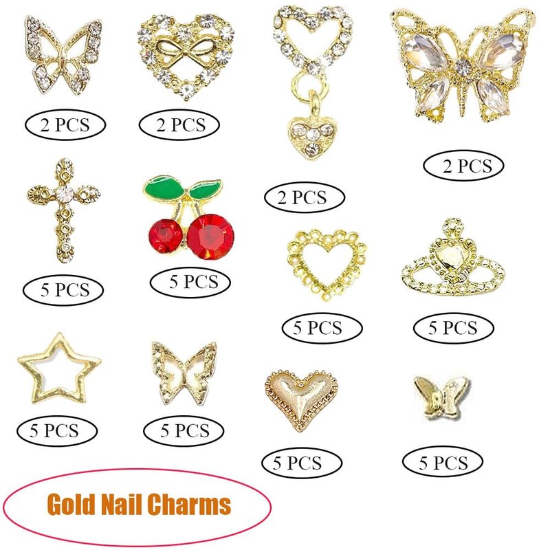 - Gold Charms for Nails:Our gold nail charms are composed of shiny artificial crystal diamonds inlay design,These nail charms including stars, planets, crosses, heart,cherry, Dangle heart charms etc. You can apply these sparkling nail charms to decorate your nails.
