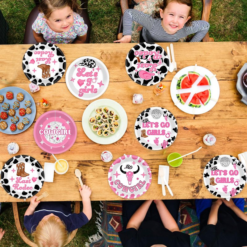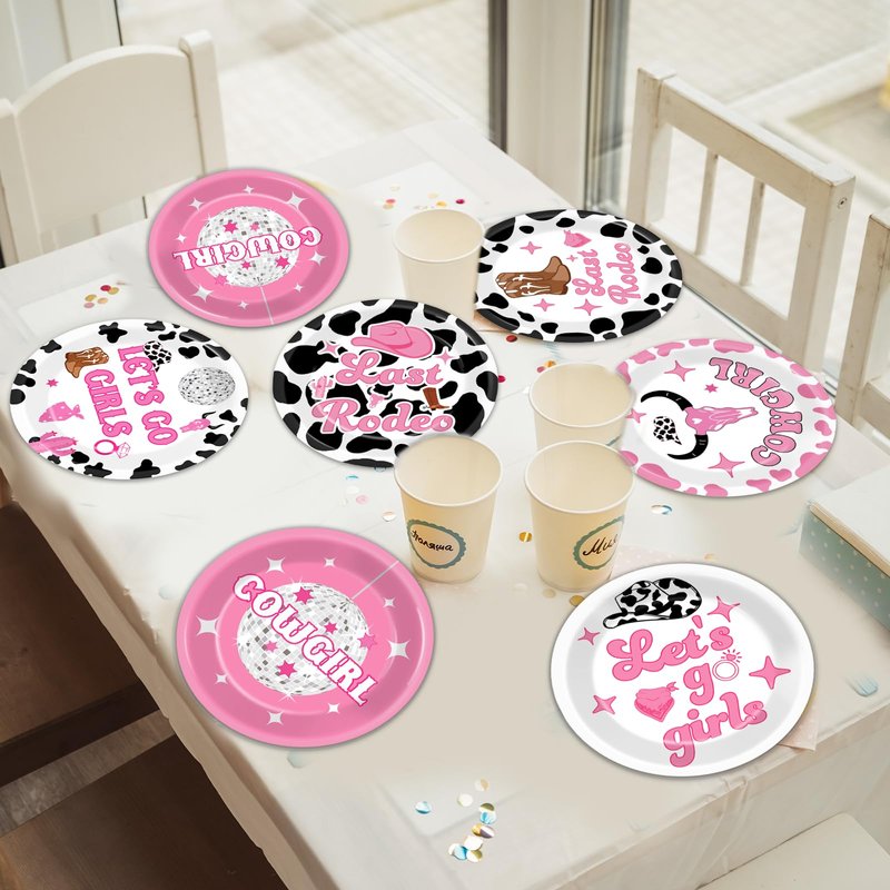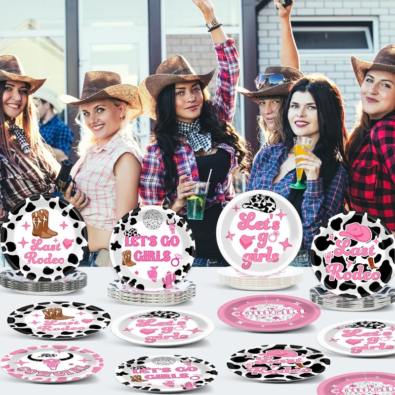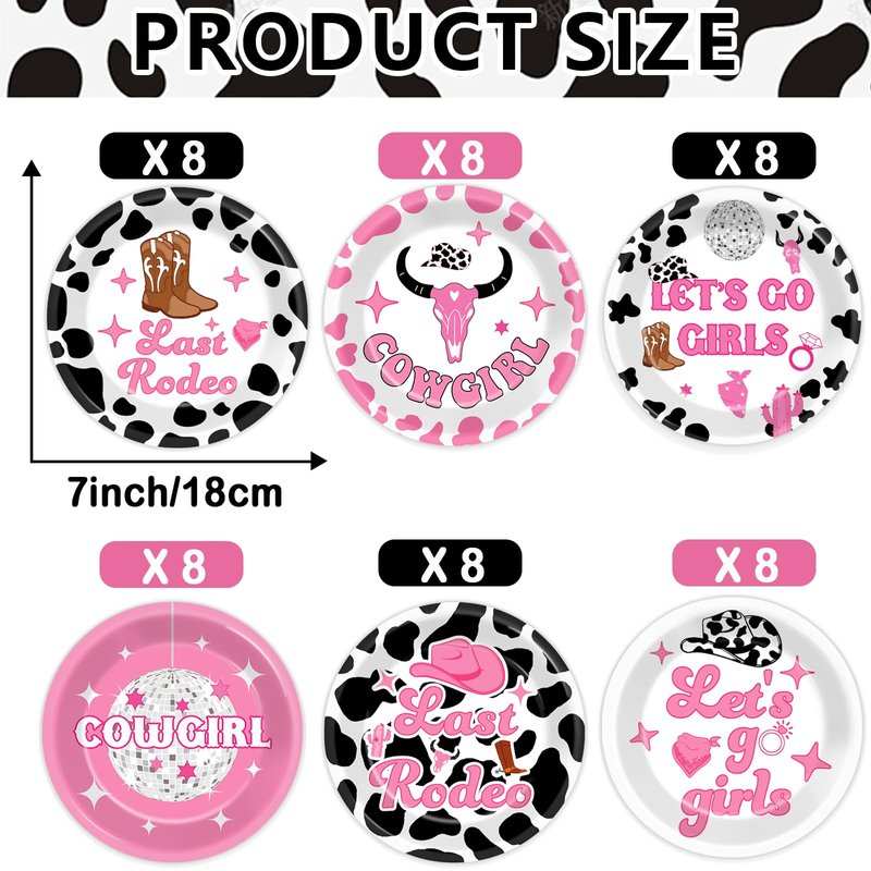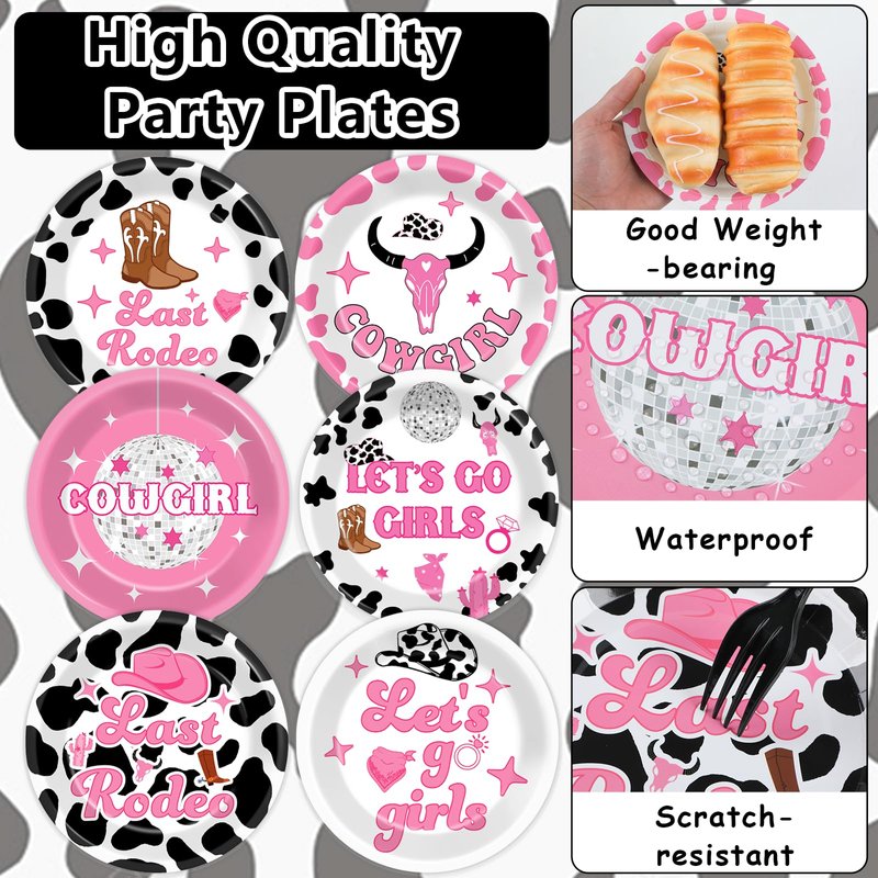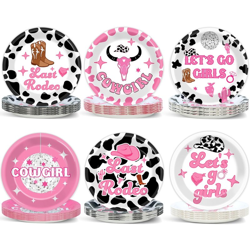 - Package includes: These western cowgirl party decorations include: 48pcs 7inch let's go girls party plates in 6 different designs. Brighten up your table setting with our disco cowgirl dinner plates that exude an appealing and cheerful atmosphere, ideal for your disco cowgirl-themed party or pink disco birthday party.