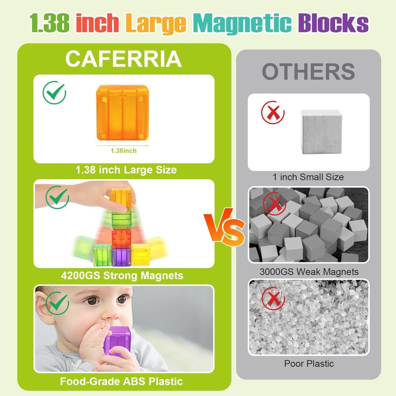 - 【1.38 Inch Large Size】These click-together magnetic blocks are 1.38 inch large size which is more suitable for children to catch, compared with other 1 inch building blocks on the market, so no worry about children swallowing them. This building toy starter set with 6 different colors, children can have fun number learning and color matching sorting games, and exercise their counting, color recognition, classification, and matching skills.