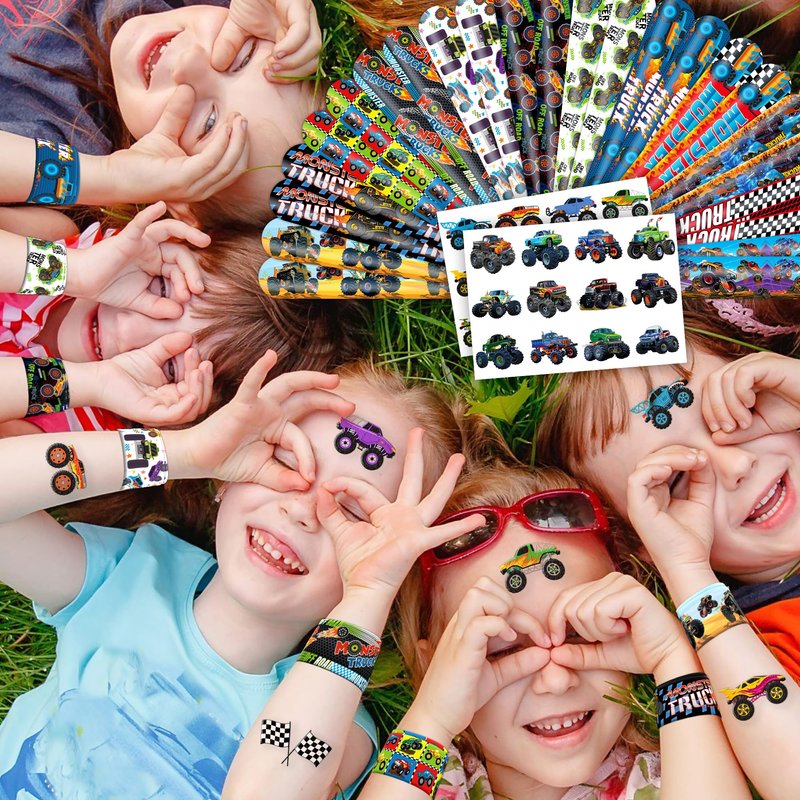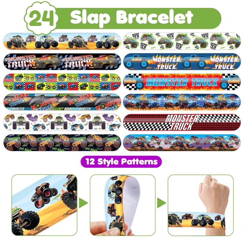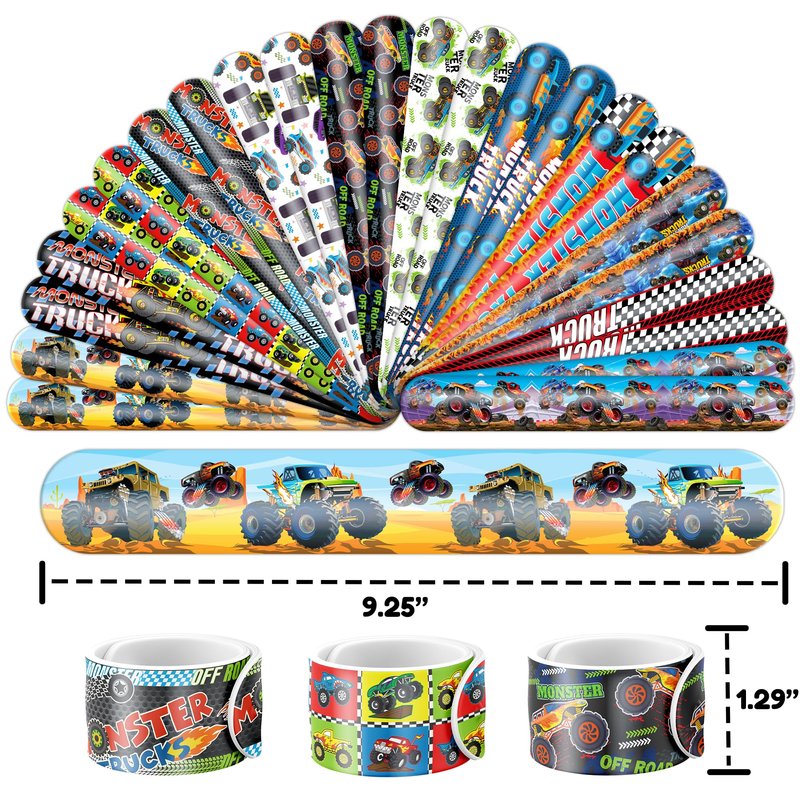 - šćMONSTER TRUCK PARTY FAVORS DELIGHTFUL BUNDLEć: Prepare for giggles with our set of 24 slap bracelets and 24 temporary tattoo stickers. Each piece features a lively and adorable design inspired by the MONSTER TRUCK theme. Perfect for boys girls and adults alike, this bundle promises boundless enjoyment. The bracelets measure 23.5cm x 3.3cm, providing a gratifying "slapping" experience as they effortlessly encircle your wrist.