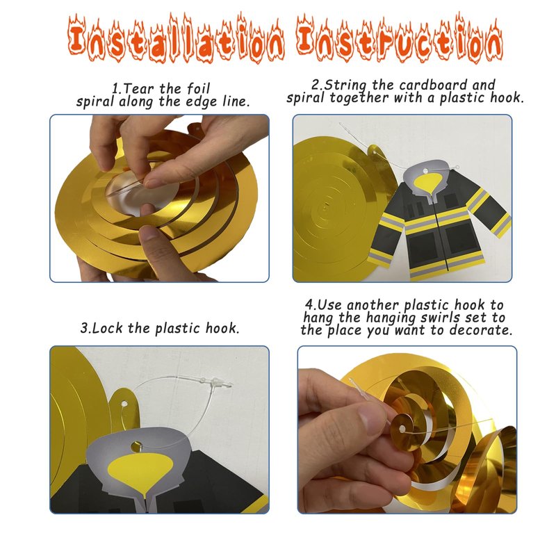 - The fireman hanging swirls decorations consists of spiral streamers and cardboard cutouts. The hanging spiral streamers are made of shiny and durable PVC, resistant to bending and not fragile. Also, the cardboard cutouts are from high-quality card stock, thick and high-definition printed.
