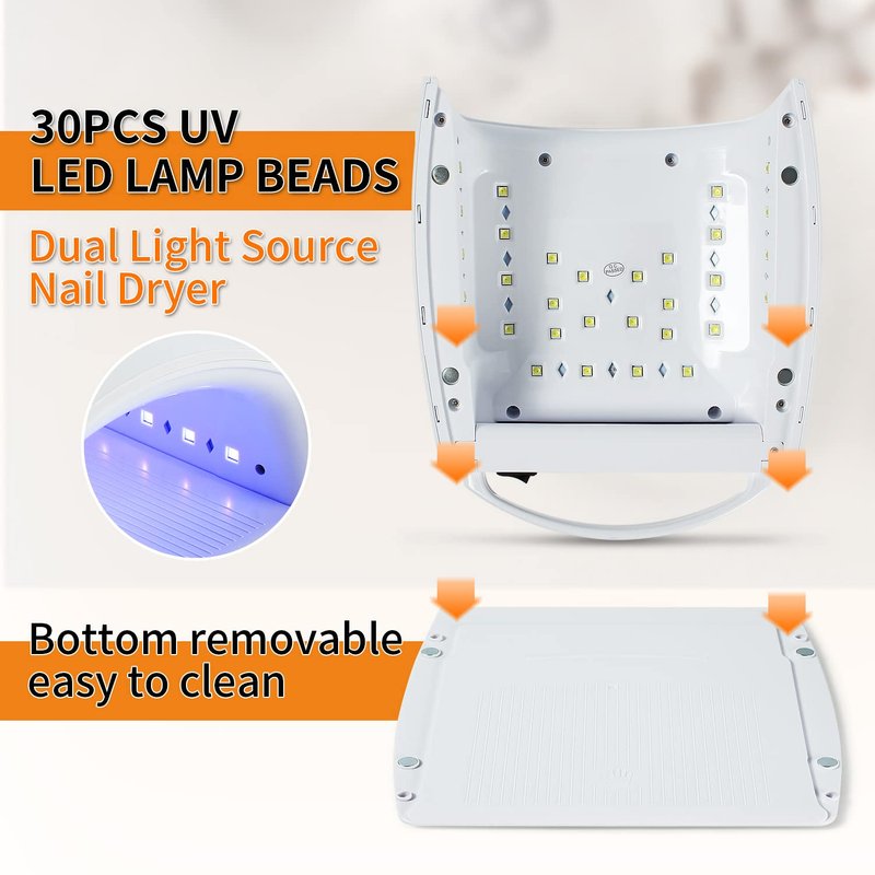 - UV Light for Nails: Easy-to-carry UV gel nail lamp(Rechargeable UV Led nail lamp). The UV light for nails is equipped with 30 UV/LED dual light sources, and the interior is surrounded by 180°LED lamp beads. The nail light will not harm your eyes and skin, can protect your skin from darkening or burns, and bring you a safe and comfortable experience! The removable base UV/led nail lamp is easy to clean. The curved design can better focus the light on the Finger, thereby curing faster.