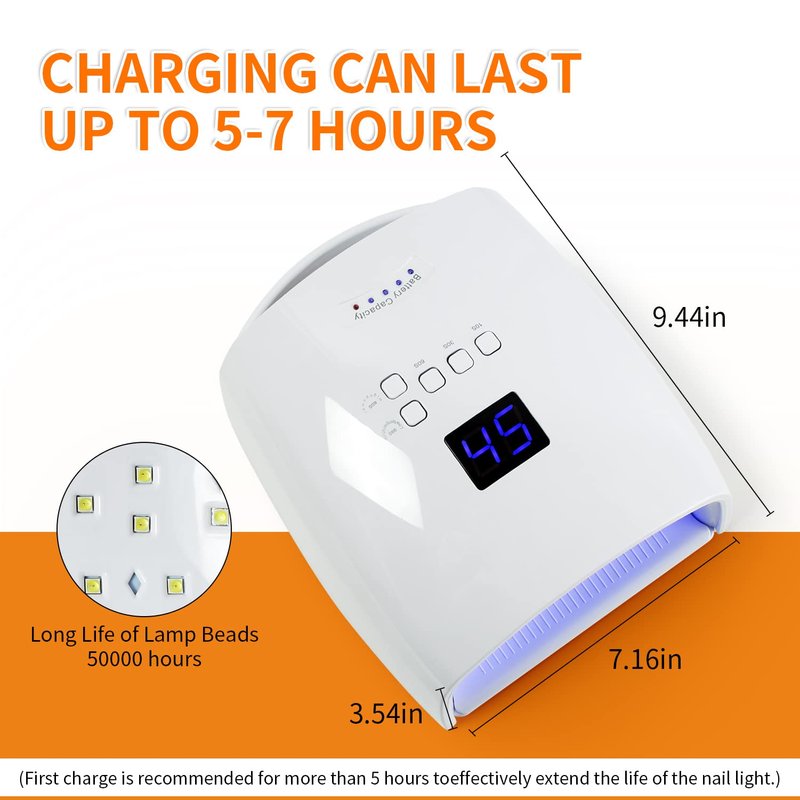 - Rechargeable Wireless Nail Dryer: A one-button switch can protect the battery life of the gel nail UV light professional, Energy-efficient. This led gel nail lamp can continue to work for 5-7 hours (can be used while charging), you can enjoy the nail art.