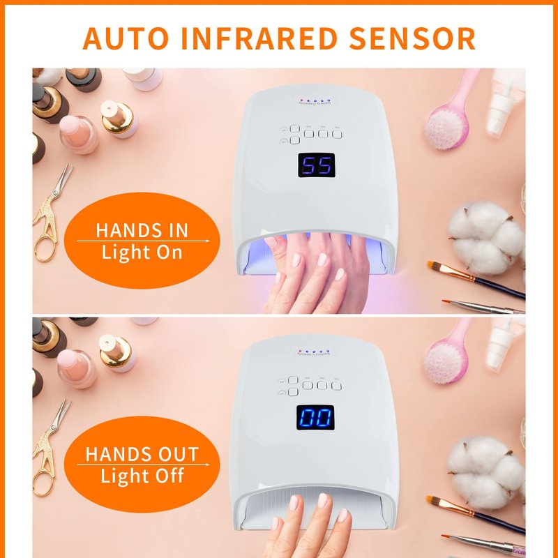 - 5 Timing Smart Modes: Open the nail polish curing lamp, the smart sensor has begun, which saves electricity and protects hands. saving power to protect your hands. 3 basic timer modes: 10s/the 30s/60s, and two smart modes: 60s painless low-temperature mode and 99s high-temperature mode (clockwise timing display). Choose the appropriate DIY mode to better cure the gel Nail polish.