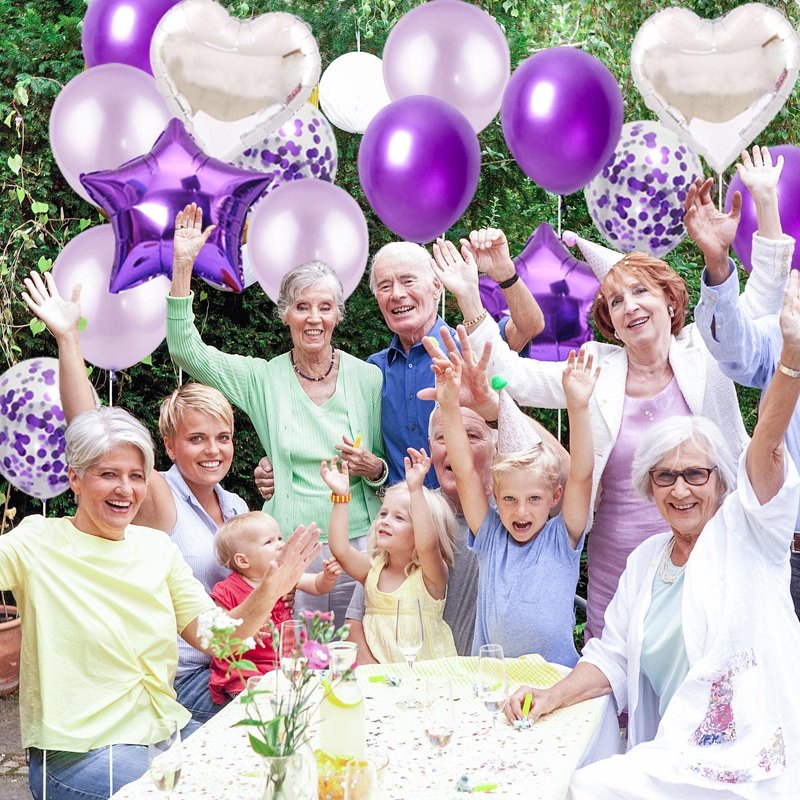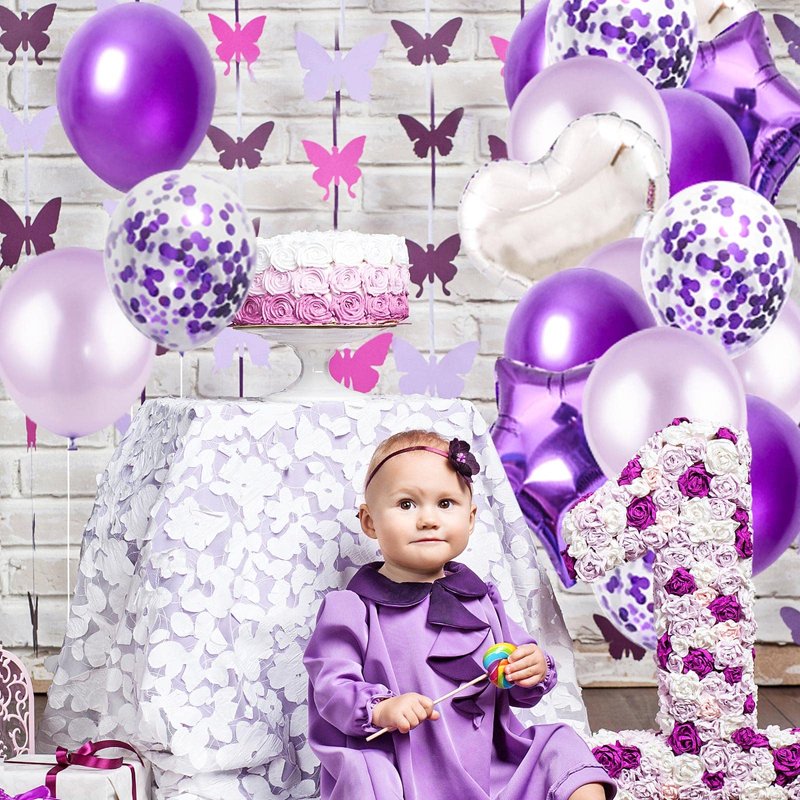 - the purple birthday balloon kit includes: 1 set of 16inch happy birthday balloons,2pcs 18inch purple five-pointed star balloons,2pcs 18inch silver love-heart balloons,12pcs 12inch deep purple balloons,12pcs 12inch light purple balloons,6pcs 12inch purple confetti balloons,2pcs purple fringed curtain,1 roll of ribbon.