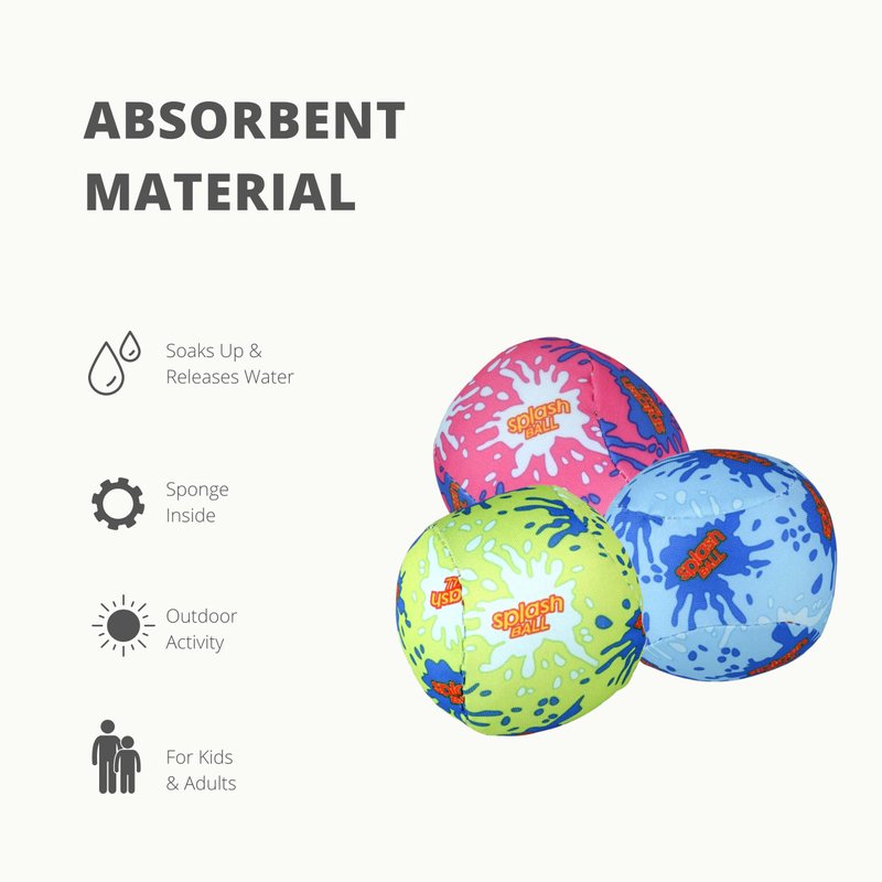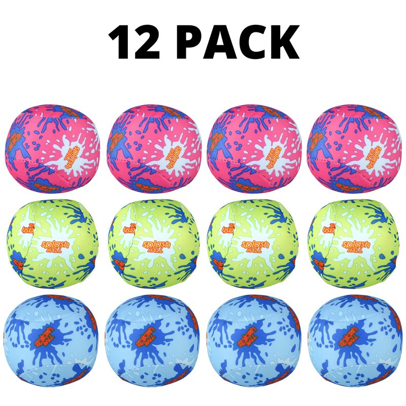 - 12 SPLASH BALLS: Features vivid neon colors Blue, green, pink. Nylon absorbent fabric covered foam balls. Each ball measures 3" inches in diameter. Just let the balls soak up water and they are ready to toss.