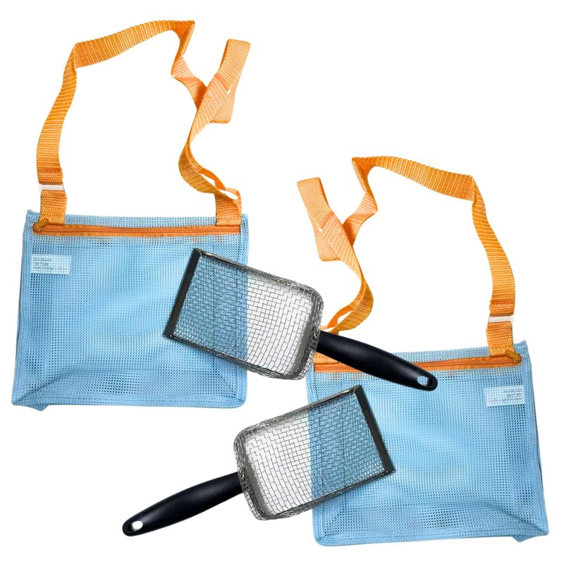 4E's Novelty 2X Shark Tooth Sifter for Beach with 2X Small Mesh Beach Bag for Shell Collecting, Metal Sand Scoop for Picking Up Shells - Beach Toys for Kids (2 Sets)