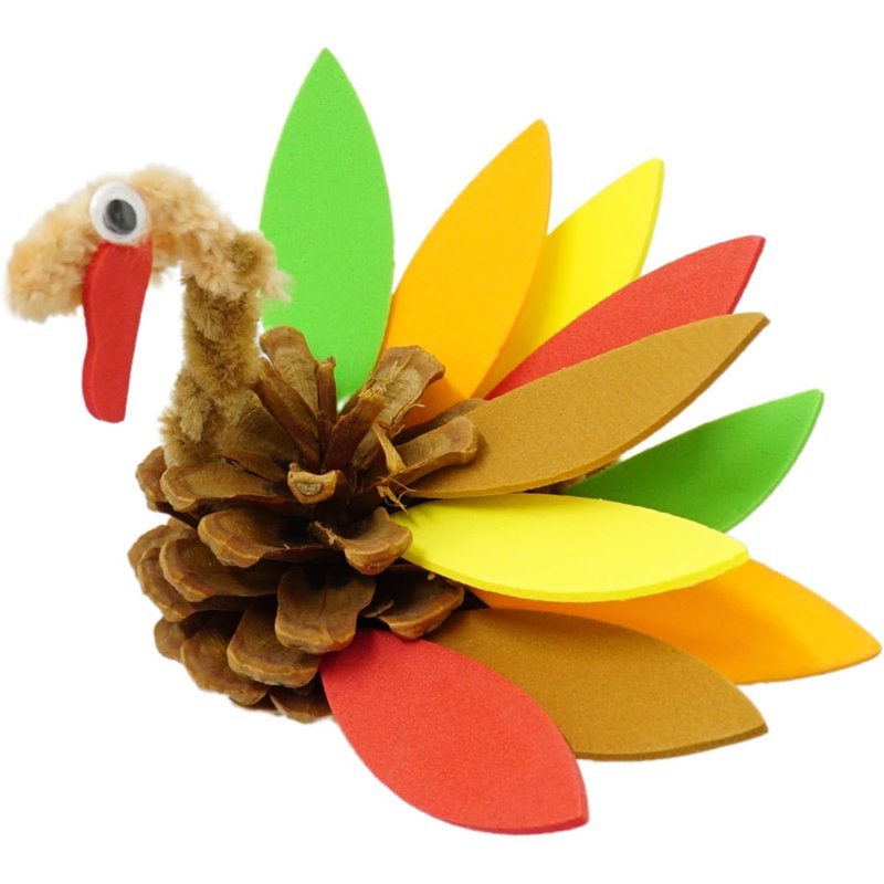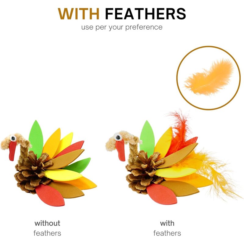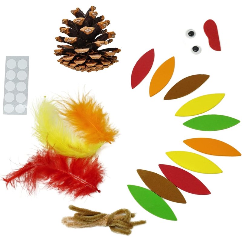 - A FEATHERED MASTERPIECE: From turkey projects for kids to fun-filled crafting for adults, this kit offers everything you need to create your own turkey masterpiece. With self-adhesive feathers, pipe cleaners, real pinecones, and googly eyes, assembling your turkey is a breeze. No extra supplies needed, making it a perfect group activity for Thanksgiving celebrations!