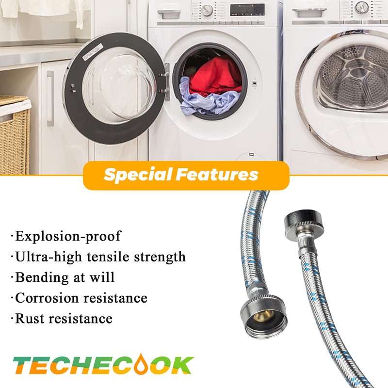 4ft Premium Stainless Steel Washing Machine Hoses Burst Proof 2 Pack by Techecook - Hot and Cold Water Supply Hoses for ALL Washer - 10 YEARS WARRANTY