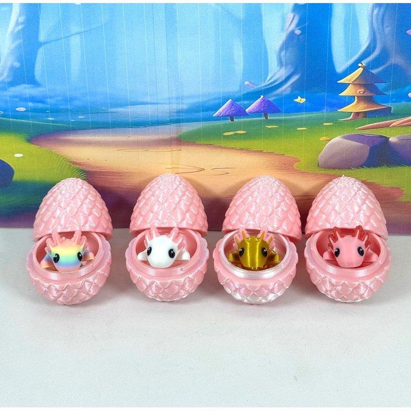 Introducing our 3D Printed ARTICULATED Mini Axolotl with EggS. Each mini Axolotl measures 1.75" long. These 4 pcs posable mini Axolotl are meticulously crafted with an eye for detail, this interactive desk accessory is not just a source of entertainment; it's also a stress-relieving toy and a chic decor piece for any space. ------- Small Components Advisory: ------- Please be mindful that this product may contain small components and may not be suitable for very young children. Due to the nature of 3D printing, there is a potential for small components to detach if handled aggressively or dropped. As such, we advise against allowing younger children to engage with the AXOLOTL. Please be aware that 3D printed objects may exhibit minor imperfections like layer lines, inherent to the printing process. While we strive for the highest quality, these imperfections contribute to the distinctive character of each piece, making each Axolotl uniquely crafted for you. The available color options are illustrated in the provided photos. Keep in mind that variations in color may arise from discrepancies in filament production and the characteristics of your monitor or screen. Additionally, the use of multi-colored filament rolls can influence color distribution in the prints. ------- Licensing Information: ------- Authorized Design: NOHo3D holds the official authorization for the production of this exquisite design created by Zou3D designs.