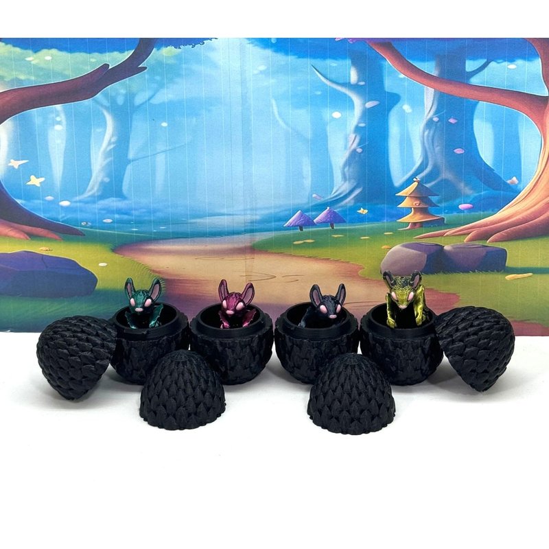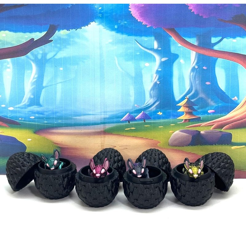 Introducing the MULTI COLOR/ASSORTED COLORS 4 pcs. Mini Bats with 4 Eggs, Your Articulated 3D-Printed Pal! Meticulously crafted with an eye for detail, this interactive desk accessory is not just a source of entertainment, it's also a stress-relieving toy and a chic decor piece for any space. Get ready for a unique experience with these 4 cuties, they are available for purchase with its very own Egg with Case, offering a perfect spot to conceal tiny treasures or partake in a delightful game of peek-a-boo! ------- Small Components Advisory: ------- Please be mindful that this product may contain small components and may not be suitable for very young children. Due to the nature of 3D printing, there is a potential for small components to detach if handled aggressively or dropped. Please be aware that 3D printed objects may exhibit minor imperfections like layer lines, inherent to the printing process. While we strive for the highest quality, these imperfections contribute to the distinctive character of each piece, making each raccoon uniquely crafted for you. The available color options are illustrated in the provided photos. Keep in mind that variations in color may arise from discrepancies in filament production and the characteristics of your monitor or screen. Additionally, the use of multi-colored filament rolls can influence color distribution in the prints. ------- Licensing Information: ------- Authorized Design: NOHo3D holds the official authorization for the production of this exquisite design created by Zou3D. Less