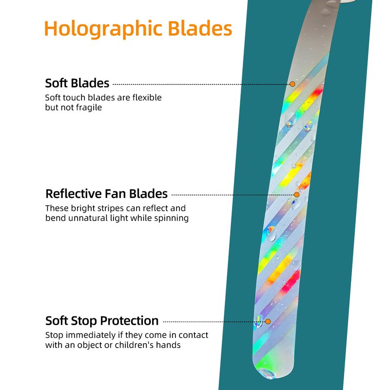 - 【Reflective Fan Blades, Soft and Safe to Touch】The holographic matrix pattern on the fan blades refracts light as they rotate, effectively repelling insects. The blades are soft to the touch and stop immediately upon contact, ensuring they do not cause harm to the hands.