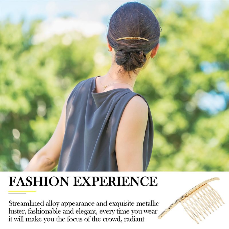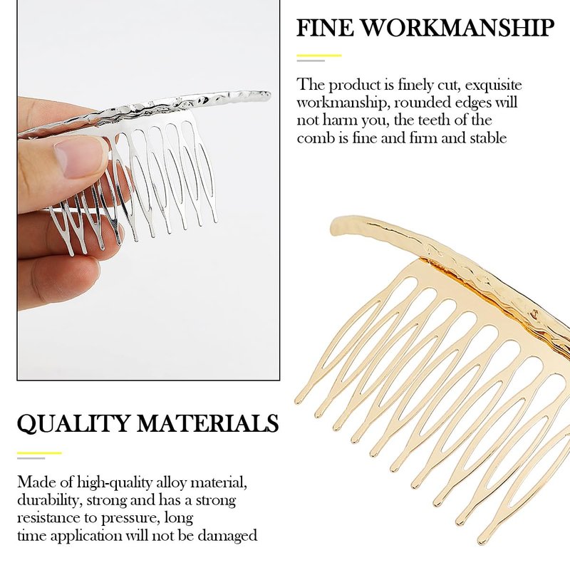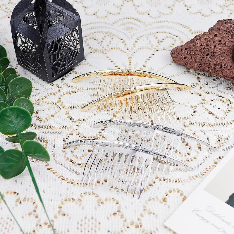 Small enough to fit in your purse or travel bag and suitable for a variety of hairstyles including updos, braids and loose waves, this comb is perfect for tweaking your hairstyle on the go, ensuring you look your best wherever you go Features: 1. 4.3x1.5inch/11x4cm,gold and silver,total 4pcs 2. Side Hair Comb made of high-quality alloy material, easy to clean without fading or deformation 3. easy to use, just insert the hair and fix in place; Simple curve shape, to help you create elegant temperament 4. Multiple occasions: Suitable for weddings, bridal hair accessories, bridesmaid headwear, anniversaries, exquisite gifts, special occasions, dances, parties Package Including: 4PCS x Side Hair Comb