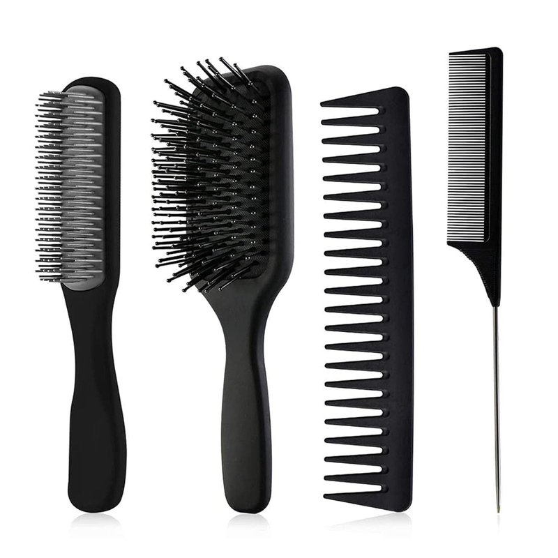 - ✔️4PCS HAIR BRUSH AND COMB SET: Include 4 kinds of brushes and combs. Paddle brush, styling brush, wide tooth comb and tail comb. Suitable for wet, dry, long, short, thick, curly and straight hair. The great detangler hair brush set for women, men, friends, children or family members of all hair types