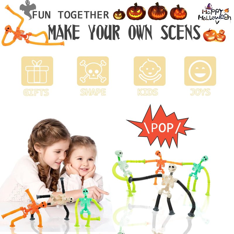 - 【Innovative Design】Each tube is connected to the skeleton's body,with a simple squeeze,skeleton pop tubes toys can be changed into various shapes to give your little ones the freedom to explore the design.Children can also put them together to create a variety of quirky and fun shapes, which can be a good exercise for their fine motor skills and creativity.