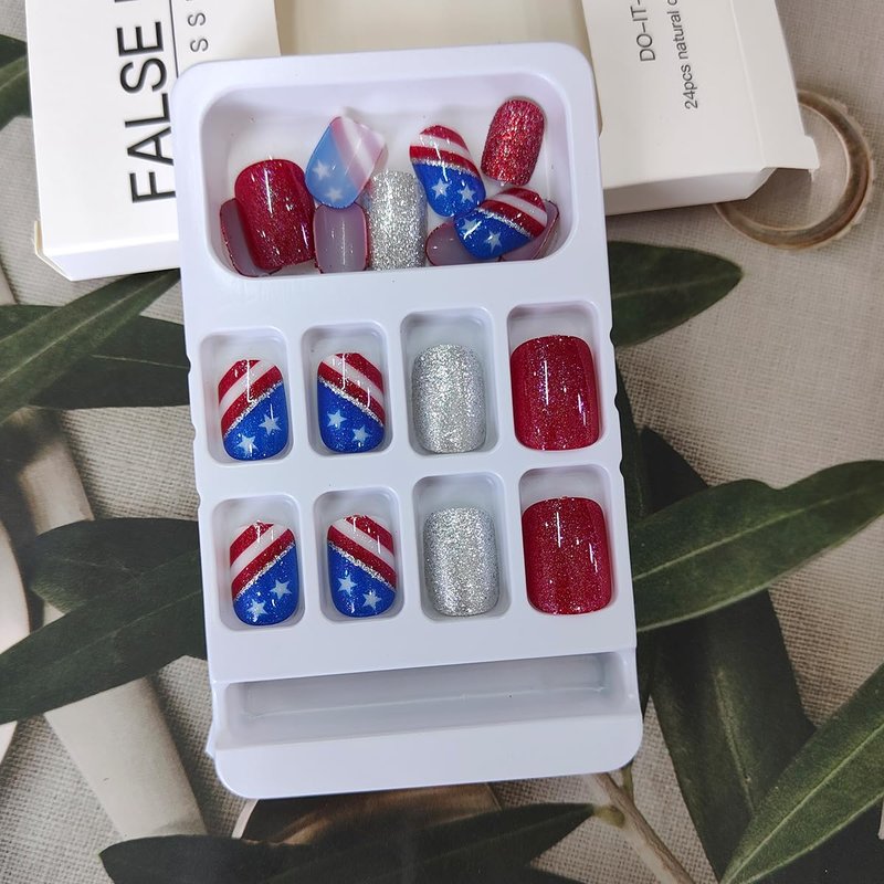 - 4th of July Nails Designs: The package contains 24 pcs short Independence Day press on nails, 1 mini nail file, 1 small wooden stick, and 24 piece of jelly glue sticker. You can safely choose a nail that fits your finger size and DIY your unique 4th of July nail art.