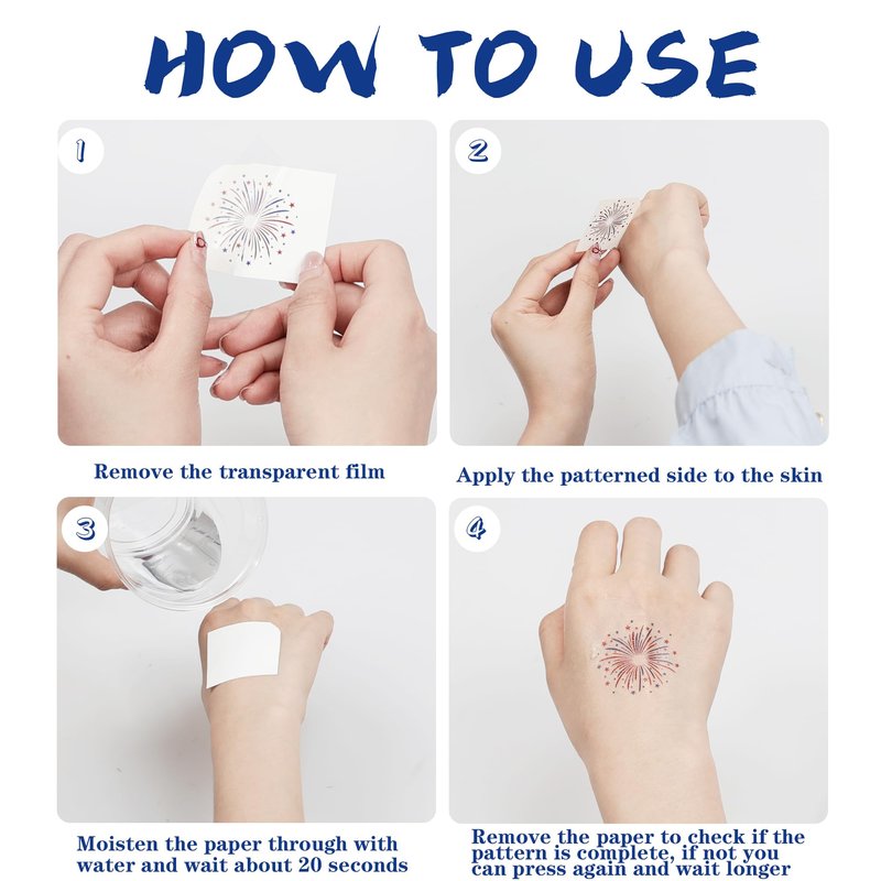 - EASY TO USE: Place the Independence Day tattoo design on clean, dry skin , gently wipe the tattoo design with a damp paper towel and wait a few moments. When you're done with your Independence Day party, it's easy to remove with a rubbing alcohol wipe.