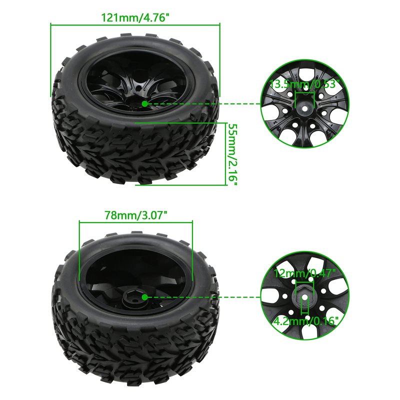 - Confirm the size before buying:Tires OD 4.76"; ID 3.07"; Width: 2.16" ; Drive Hex: 0.47" ; Diameter of the Axle Hole: 0.16"; Size Error Range: 1~3mm