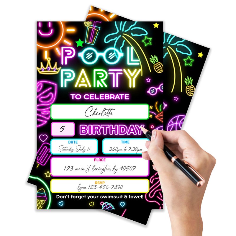 4x6 Pool Party Birthday Invitations, Birthday Invitations, Pool Party Supplies, Neon Glow Birthday Party Invitations, Kids Birthday Invitations, 20 Cards with 20 Envelopes.(27) (pool party(27))
