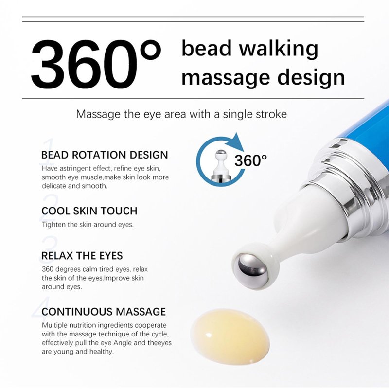 - 360°Roller Massage Ball Eye Serum: With an unique 360°cooling stainless steel roller-ball applicator, the under eye cream is evenly distributed around the eyes, fully massaging the contours of the eyes, relaxing the eyes, smoothing wrinkles and restoring firmness