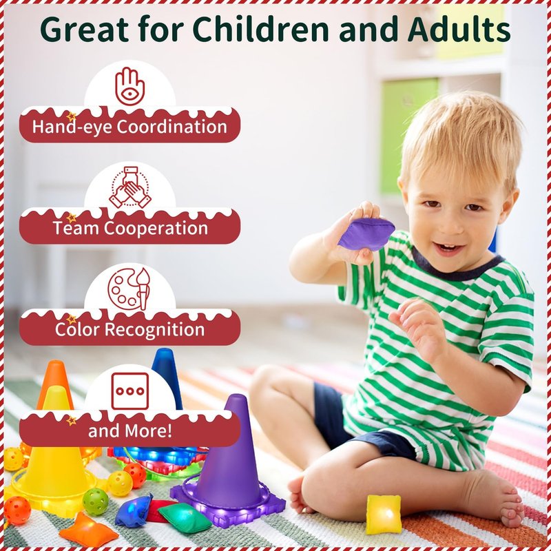 - Rich Outdoor Games: Our comprehensive carnival game set includes 6 Cones with LED Light, 6 Bean Bags with LED Light, 6 Big Toss Rings, 6 Small Toss Rings, 6 Colored Balls, 1 Clown Target Banner, 1 Storage Bag, the whole set is very convenient for storage