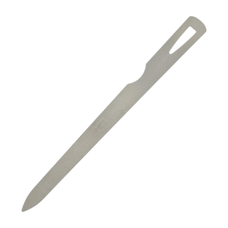 Solid stainless steel nail file, lightweight, manufacturer's lifetime warranty. Long Lasting Surface. Buying one gets you three nail files. Handy hook on the end allows for easy hanging. Use for filing, fingernails, toenails, any surface that needs light buffing and smoothing. Each files come individually wrapped. Triple Cut Score For Smoother Results. 4.5 - 5 inch length