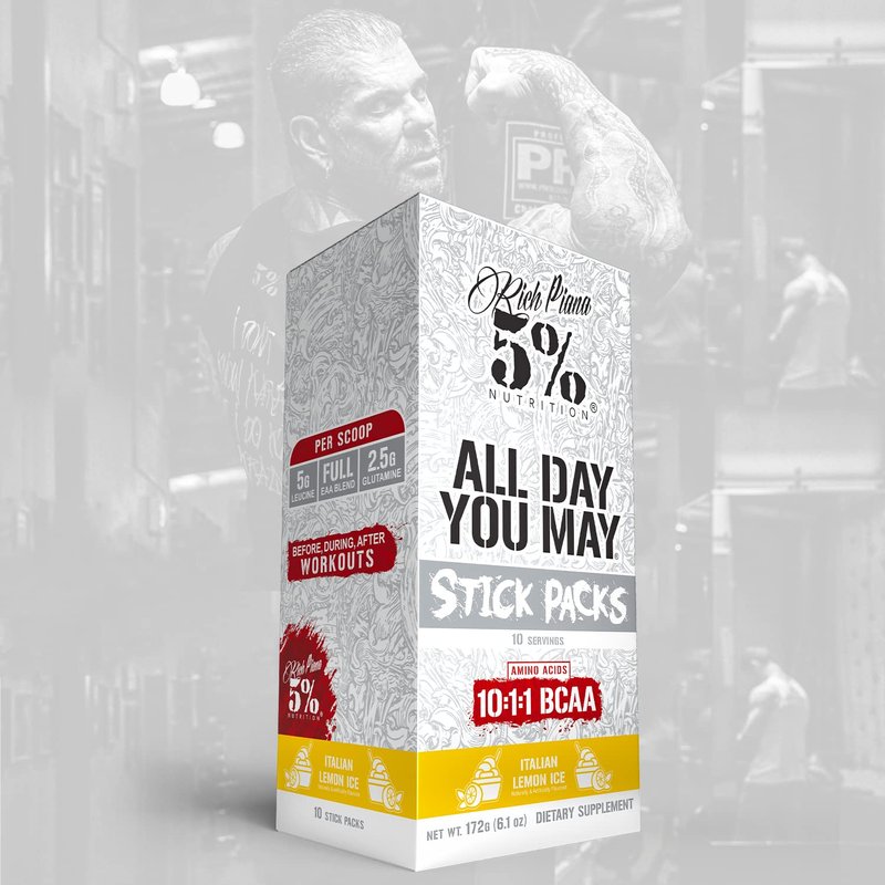 5% Nutrition Rich Piana AllDayYouMay BCAA Powder | 9g of Premium Intra & Post Workout Amino Acids for Hydration, Endurance, Muscle Recovery, Joint & Liver Support (Italian Lemon Ice)