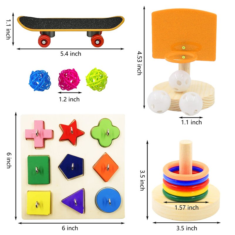 - [What will you receive?] 1 pcs wooden block puzzle toy;1 pcs bird skateboard;1pcs bird stack toy;1 pcs bird basketball toy;3 pcs rattan ball.A complete set of toys to meet all the needs of your bird.