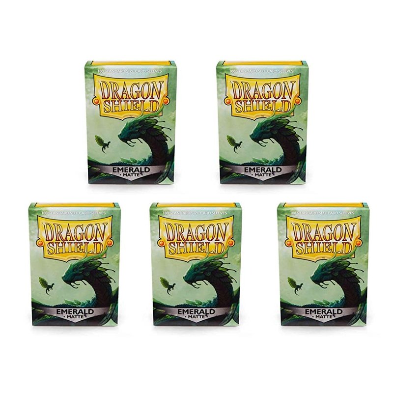 Includes 5 packs of 100ct Dragon Shield Emerald sleeves for standard-sized trading cards.