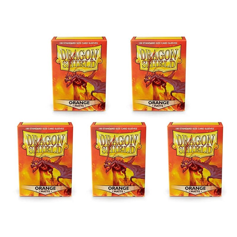 Includes 5 packs of 100 Dragon Shield Matte Orange sleeves for standard sized trading cards.