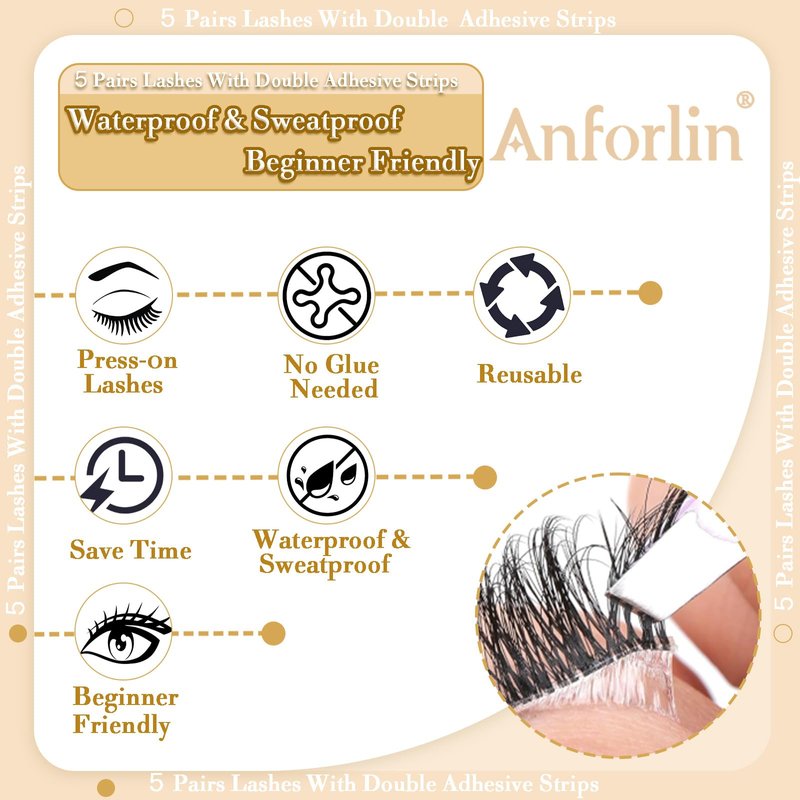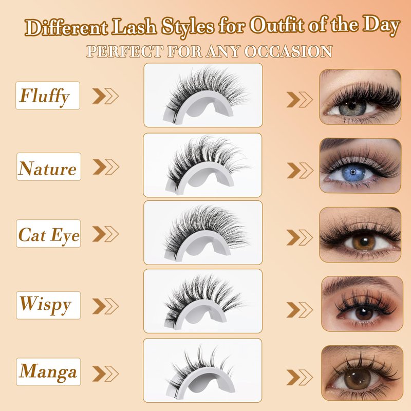 - 【Different Styles & Reusable False Lashes】Anforlin self adhesive eyelashes included 5 pairs of false lashes, in 5 different styles: Fluffy, Wispy, Cat eye, Nature, Manga. You can choose according to your makeup and outfit of the day. And these self-adhesive lashes can be used many times with proper care.