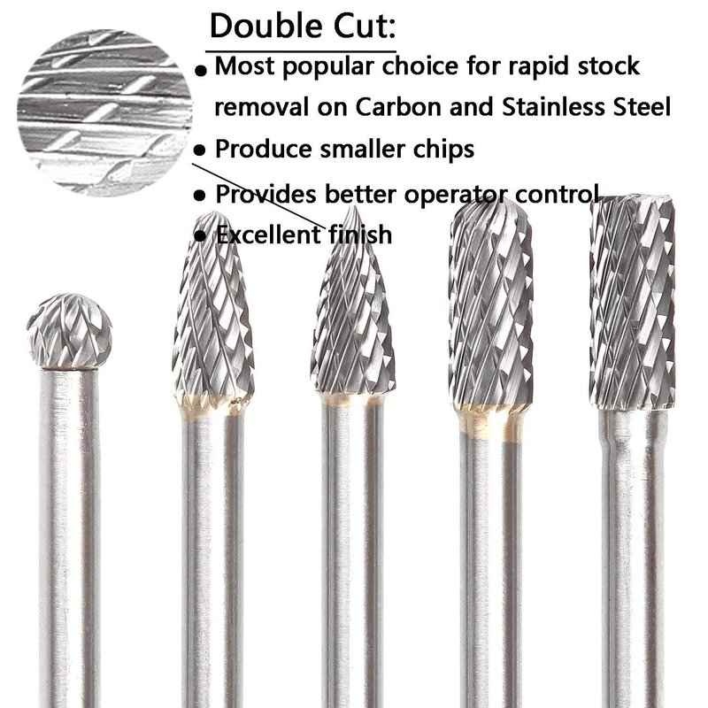 - Double Grinder Carbide Burr Set: Double-cut style has rows of cutting teeth cut in two intersecting directions for fast material removal and a rougher finish