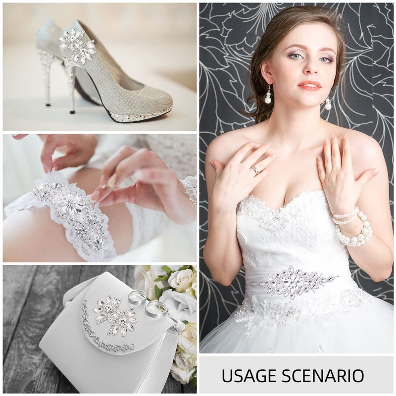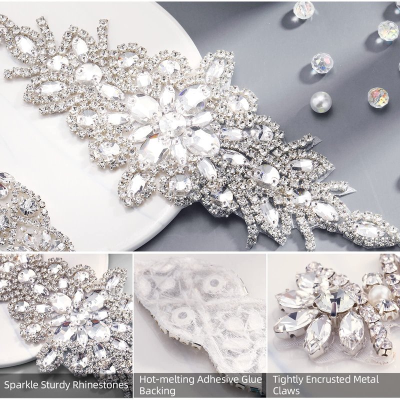 These rhinestone applique patches can be applied on wedding belts, sashes, shoes, clothes, headbands, veils, dresses, brooches, flower girl baskets, wedding garters, bobby pins, buckles and so on, versatile to use.
