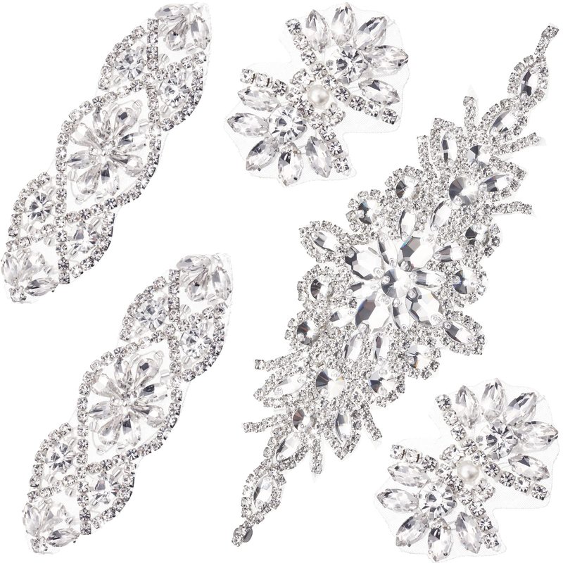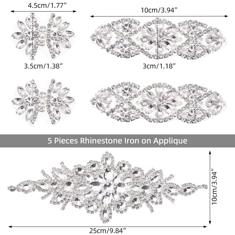 5 Pcs Crystal Rhinestone Applique Silver Wedding Applique Iron on Rhinestone Sash Applique Rhinestone Hair Applique for Bridal Wedding Dress Clothes Shoes(Exquisite Style)