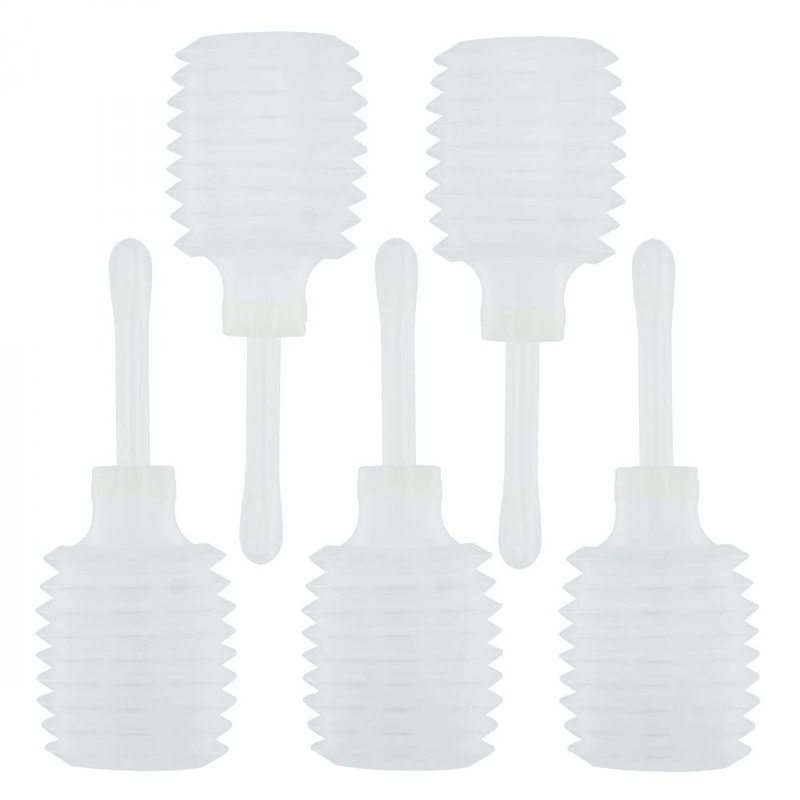 These one time use douche or enema bulbs are the ultimate in simple, hygienic cleansing. No need to worry about cross-contamination. These simple, accordion style pumps are one time use, so you can easily dispose of them. No clean up or mess to worry about. There are 5 total, so you can stay stocked up and ready for deep, comfortable, effective cleansing any time. Measurements: Each bottle holds 150 ml. Material: Plastic. Color: Clear. Note: Comes with 5 disposable personal cleansing bottles.