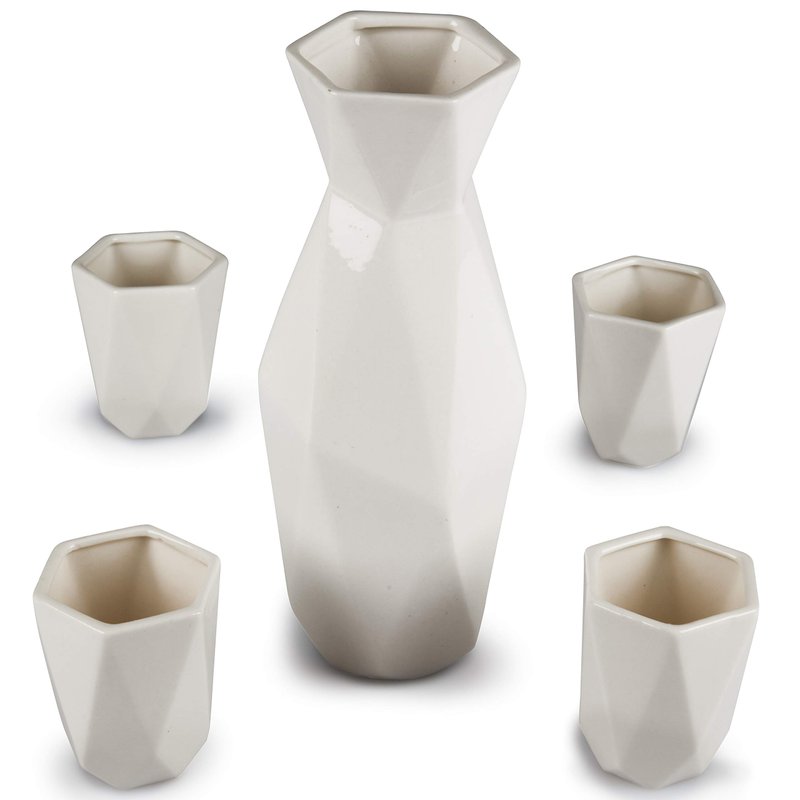 5 Piece Traditional Porcelain Japanese Sake Set, White - 1 18 oz Tokkuri Bottle and 4 Ochko Cups - Unique Modern Design - Great Holiday and Housewarming Gift