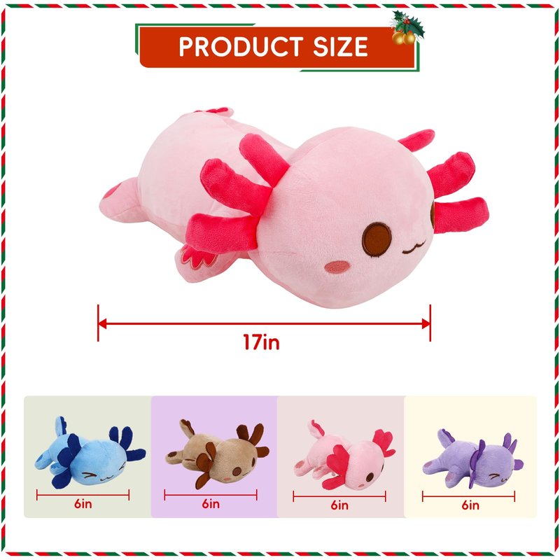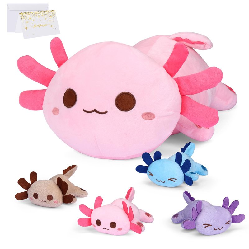 - Stuffed Animals Set: Includes 1 plush pink mom axolotl and 4 baby axolotls: a pink one with open eyes, a brown one with open eyes, a blue one winking, and a lavender one winking; Rich and cute shapes; Promotes social skills and creativity in children; Perfect for sharing with friends