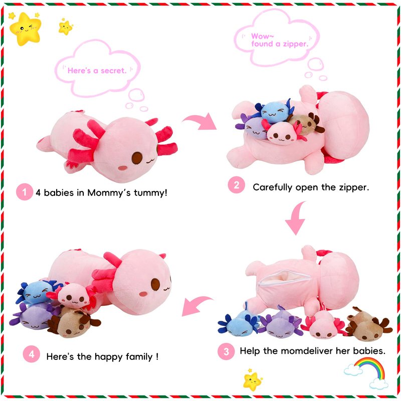 - Axolotl Mother Birth Design: Features a zipper on the mom axolotl's tummy; Kids can easily remove and store the 4 baby axolotls; Fun details with adjustable noses on each axolotl