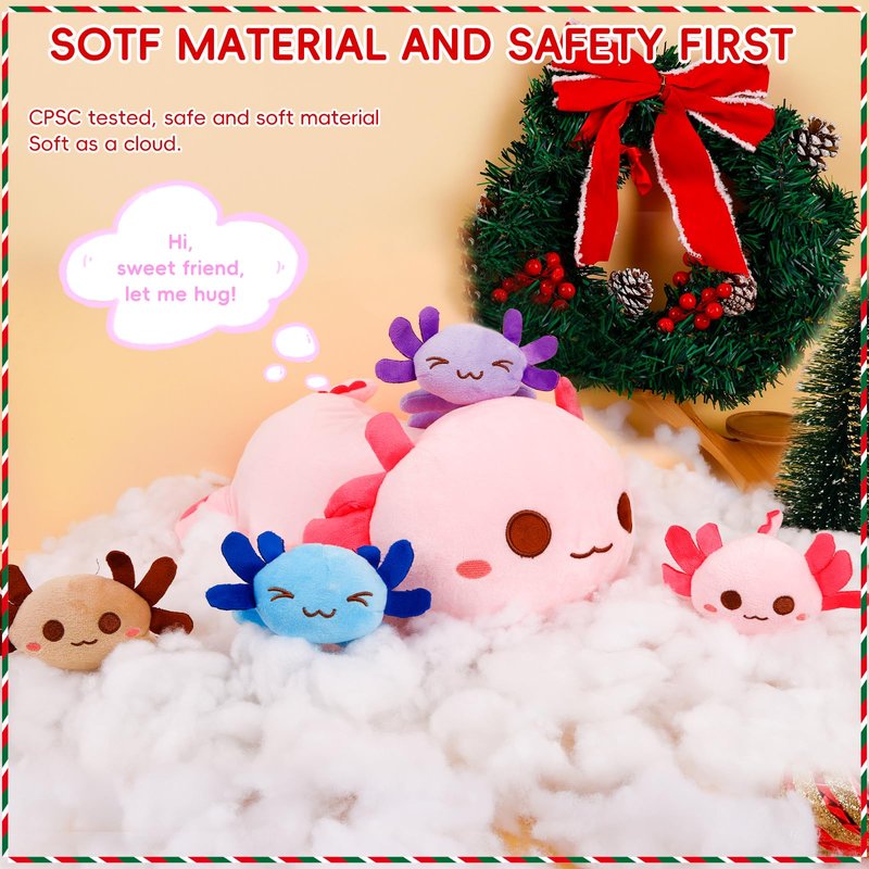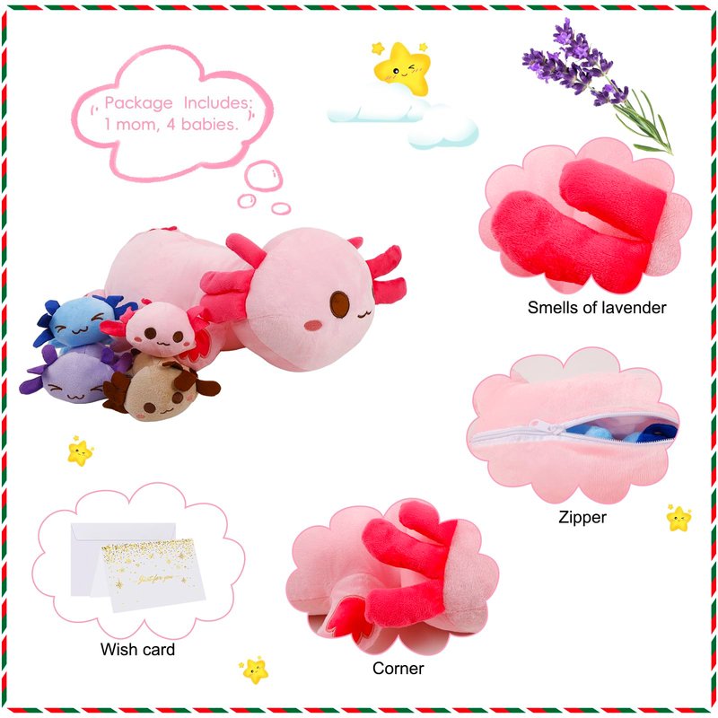Five Toys in Box: 4 cute baby axolotls in mommy's belly, open the zipper you can see that, what a surprise! The girls absolutely love them and can't wait to cuddle and play with them. This plush toy set comes in a delicate gift box, perfect for a gift for girls ages 3 4 5 6 7 8.