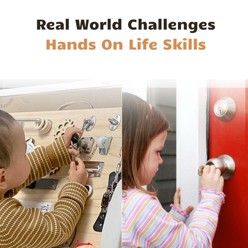 - Comprehensive Lock Set: Introducing our newest, most exciting lock series for your busy board! This all-in-one set features a variety of locks - a latch, chain lock, key lock, gate hook, and combination lock - giving your little ones a hands-on, real-life locking experience.