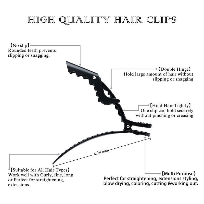 2 pieces gator clips are made of plastic, can help you to clamp excessive long hair.